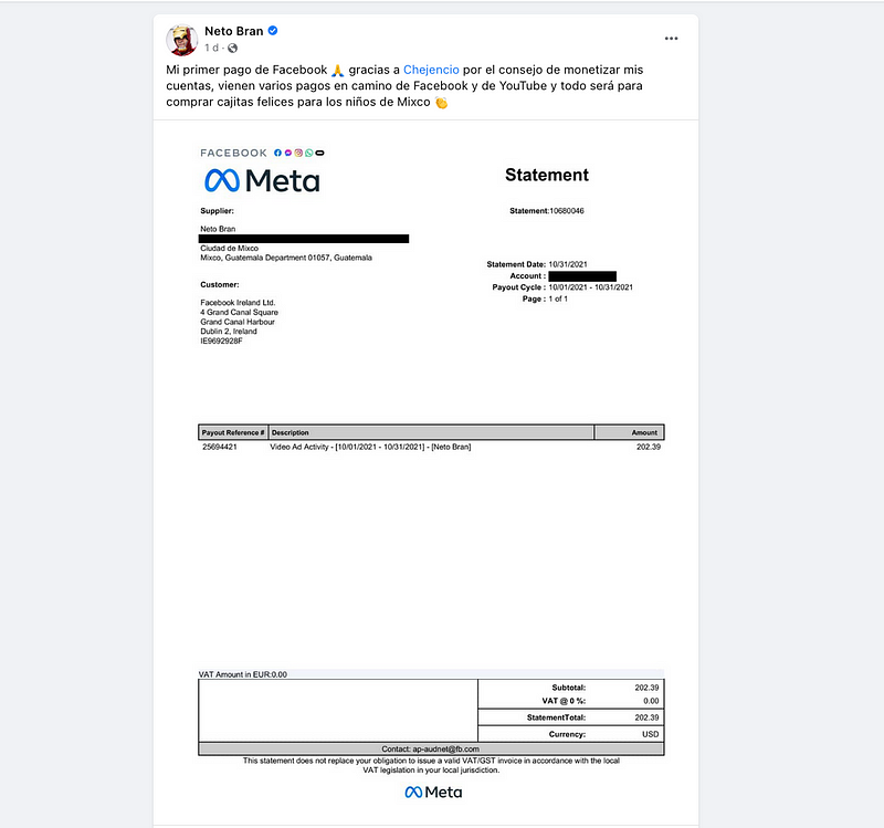 Neto Bran, Mayor of Mixco city, posted an statement from Meta with his earnings monetizing content from his Facebook Fan Page. He was thankful because a content creator told him to start monetizing his Social Media accounts. He also offers to buy happy meals to children in that city.