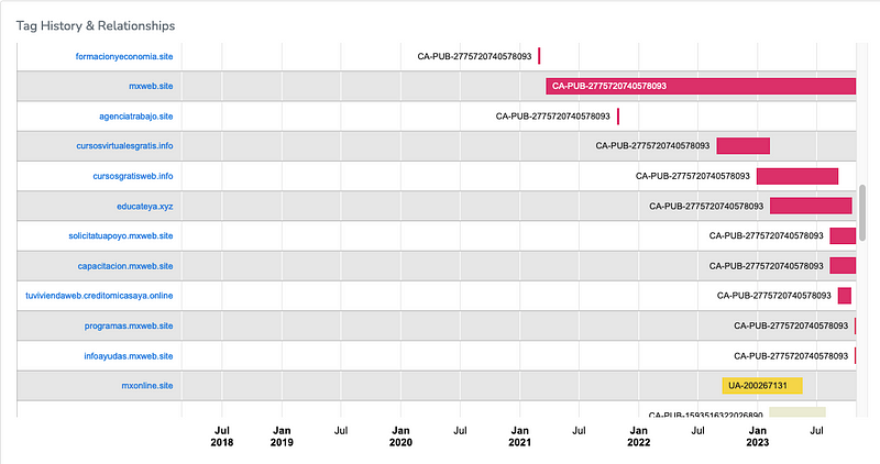 Aquí se puede ver que hay sitios web inactivos, pero que comparten Tags. Y sitios como el que usamos de referencia tienen múltiples tags para medir tráfico.