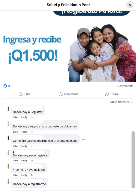 En muchos de los posts se pueden ver comentario de personas pidiendo información y dispuestos a dar información personal para “registrarse” y poder recibir el dinero.