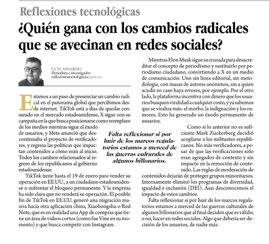 Estamos a un paso de presenciar un cambio radical en el panorama global que percibimos desde internet. TikTok está a días de quedar censurado en el mercado estadounidense, X sigue con su campaña en la que busca posicionarse como reemplazo de los medios mientras sigue el éxodo de usuarios, y Meta anunció que descontinuaba el proyecto de verificadores, y regresa las políticas que impactan contenidos a cómo eran al inicio. Todos los cambios relacionados al regreso de los republicanos al gobierno estadounidense.