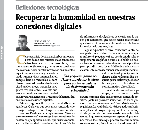 - Mi columna en el Diario de Centroamérica: Con cada inicio de año, muchos buscamos maneras de mejorar nuestras vidas con nuevos retos: hacer ejercicio, leer más libros, o comer más sano. Sin embargo, pocas veces consideramos cómo mejorar nuestra interacción en uno de los espacios más relevantes y desgastantes de nuestras vidas: internet. La red, aunque llena de maravillas, es también un océano donde las olas de toxicidad pueden ahogar hasta a los navegantes más resilientes. Pero este nuevo ciclo puede ser una oportunidad para revertir esa tendencia y recuperar la humanidad en nuestras conexiones digitales. Aquí el enlace a la columna.